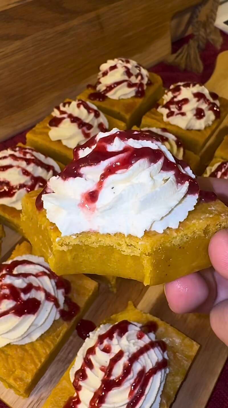 Preheat the oven, 175 degrees celcius. Whisk the eggs, brown sugar, and white sugar for 5 minutes. Add the saffron to the melted butter, then incorporate the melted butter into the mixture and mix well. Add all the other dry ingredients. Prepare a baking pan (25x20 cm) and pour in the batter. Bake for 21-22 minutes at 175 degrees celsius. Allow the brownies to sit in the fridge for at least 2 hours before adding the topping, or in the freezer for 1 hour. Whip the cream and spread it over the brownies, then drizzle raspberry jam all over.