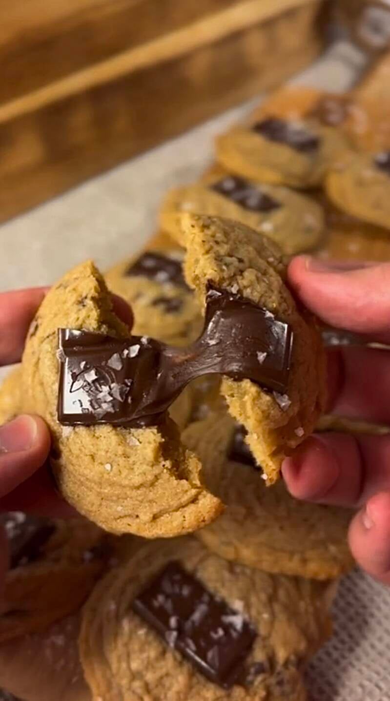 Preheat the oven, 175 degrees celcius. Combine the softened butter, brown sugar, and white sugar. Add the egg and mix well. Incorporate all the dry ingredients and mix thoroughly. Finally, add the chocolate chips and mix again. Scoop the cookie dough onto a sheet lined with parchment paper. Bake the cookies for 11-13 minutes, until they are brown around the edges (175 degrees celcius). While the cookies are still warm, place one square of chocolate on each cookie and sprinkle some flake salt on top.