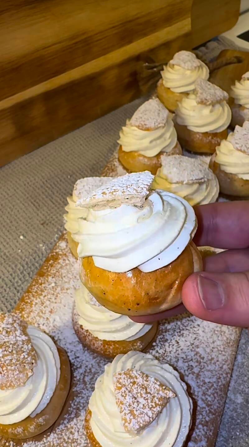 Cut some holes in the buns. Fill each hole with vanilla custard sauce. Top with whipped cream and then place the cutout piece from the hole of the bun on top. Finally, sprinkle some powdered sugar over the buns.