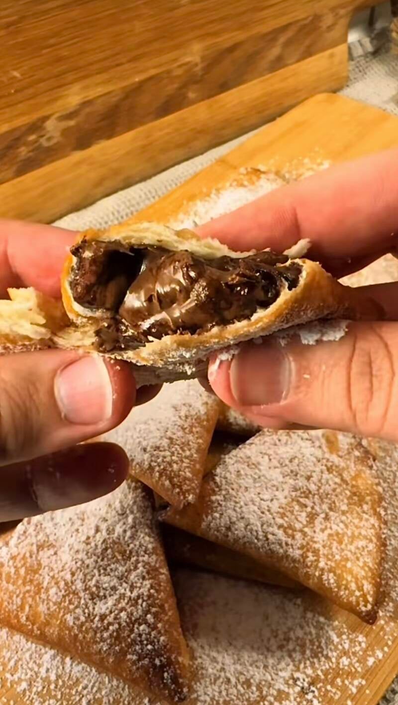 Cut the tortillas in half. Mix the flour and water together. Follow the folding method demonstrated in the TikTok video: add one tablespoon of Nutella and seal it with the flour mixture. Fry for a couple of minutes, just until the tortilla is browned. Finally, sprinkle some powdered sugar on top.
