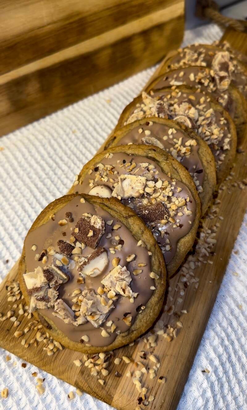 Preheat the oven, 175 degrees celcius. Combine the softened butter, brown sugar, and white sugar. Add the egg and mix well. Incorporate all the dry ingredients and mix thoroughly. Finally, add the chocolate chips and mix again. Scoop the cookie dough onto a sheet lined with parchment paper. Bake the cookies for 13-15 minutes until they are brown around the edges (175 degrees celcius). Allow the cookies to cool before starting with the topping. For the topping, melt the Kinder chocolate, chop the peanuts, and crush the Kinder Bueno. Add one tablespoon of melted Kinder chocolate on each cookie, along with some crushed Bueno and nuts.