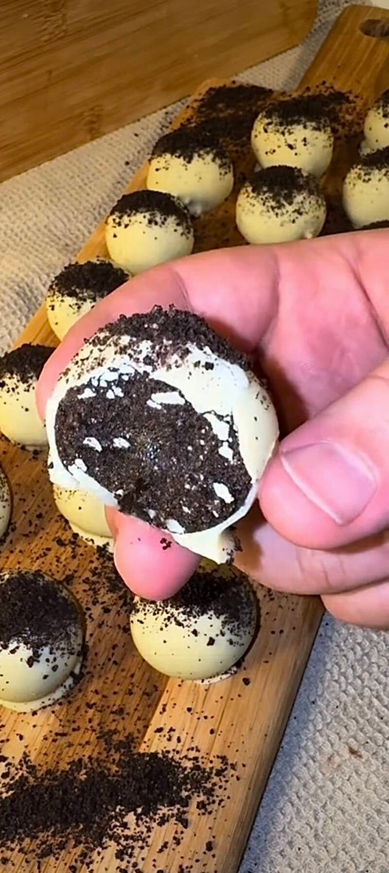 Take out approximately 5 Oreos from the packs, separate the filling, crush them, and set them aside for later use. Crush all the other cookies and mix them with the cream cheese. Roll the dough into small balls. Melt the white chocolate, dip the Oreo balls into the melted chocolate, and sprinkle the extra crushed Oreos on top (the ones saved in the first step). Allow them to sit in the fridge for 30 minutes.