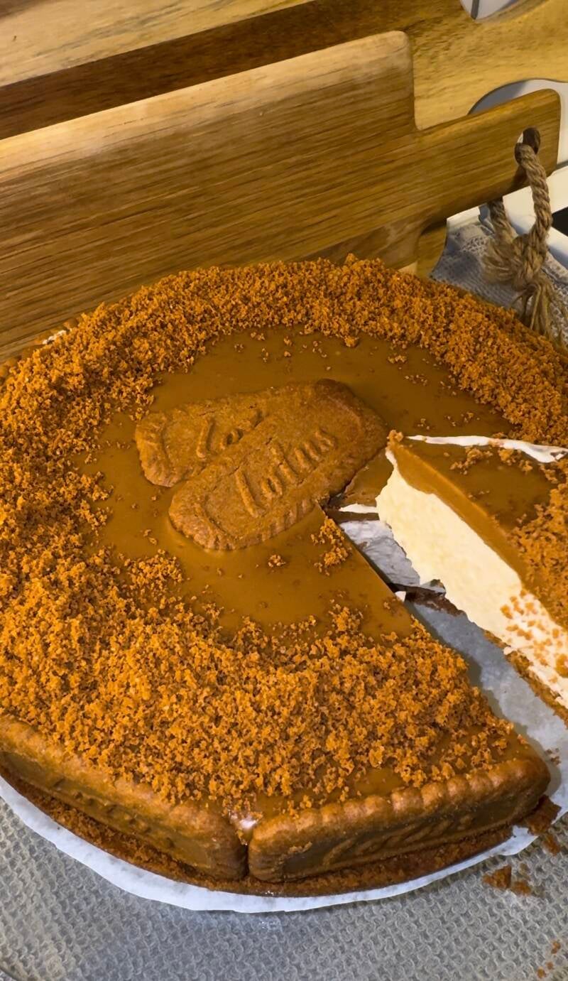 Crush 200 grams of Biscoff cookies and mix them with 5 tablespoons of melted butter. Line the form with parchment paper. Press the mixture into a springform pan, and place some Biscoff cookies along the sides of the form. Chill the base in the fridge while you prepare the cheesecake batter. Begin by whipping the cream. Then, add all the other ingredients and mix thoroughly. Pour the cheesecake batter into the prepared form. Warm up the Biscoff spread until it's slightly runny, and drizzle it over the cheesecake. Sprinkle some crushed cookies on the sides. Allow it to chill in the freezer for at least 1,5 hours before serving.