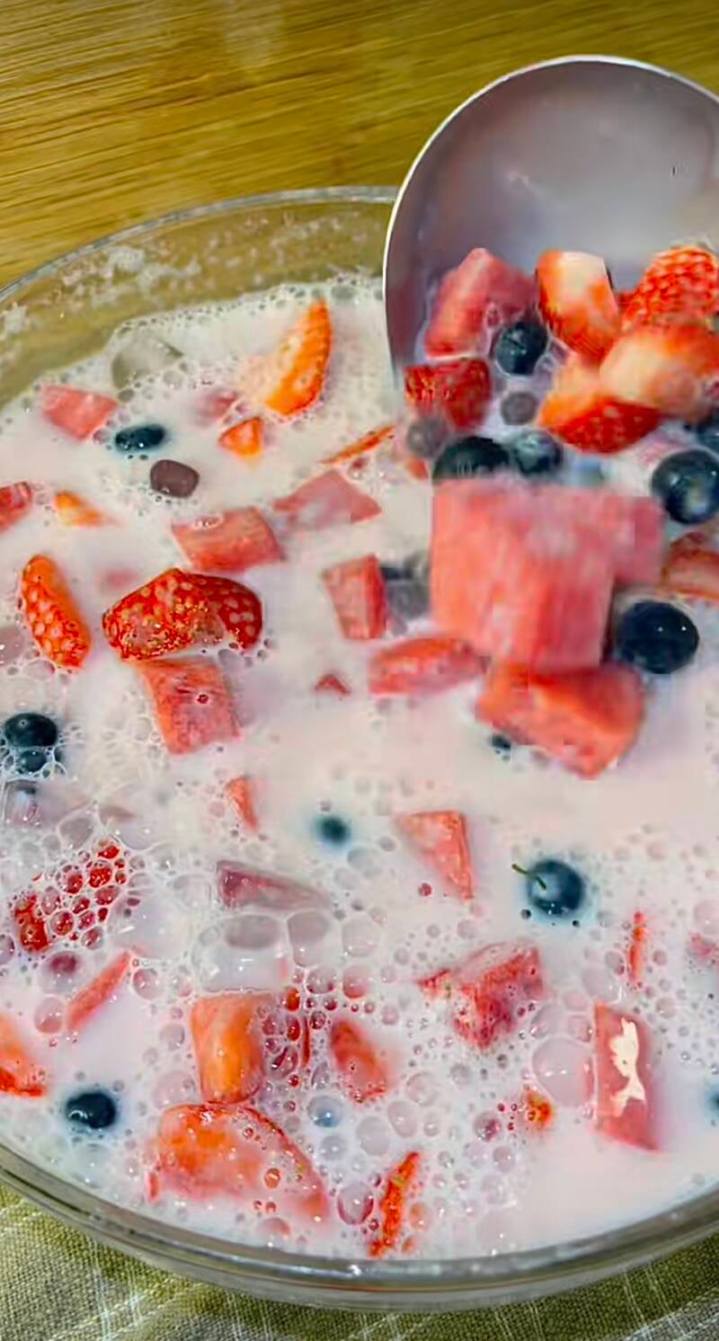 Cut all the fruits and add them into a bowl with the ice. Add the milk and then the sprite. Mix and Enjoy.