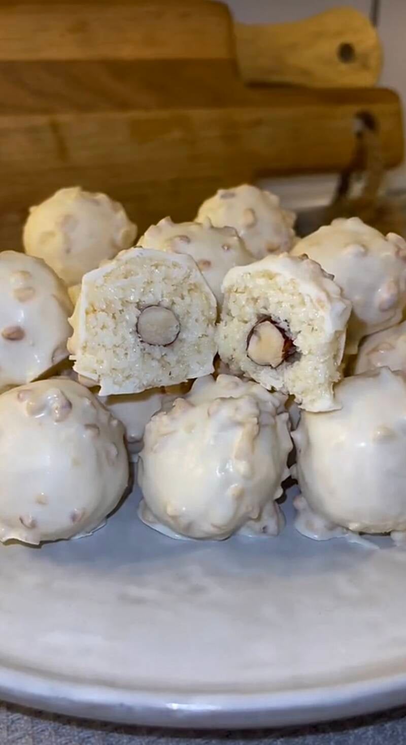 Mix the coconut and condensed milk together. Form into small balls and make sure to put one whole hazelnut in each one. Melt the chocolate, add the chopped hazelnuts and dip the balls into the chocolate. Let them set.