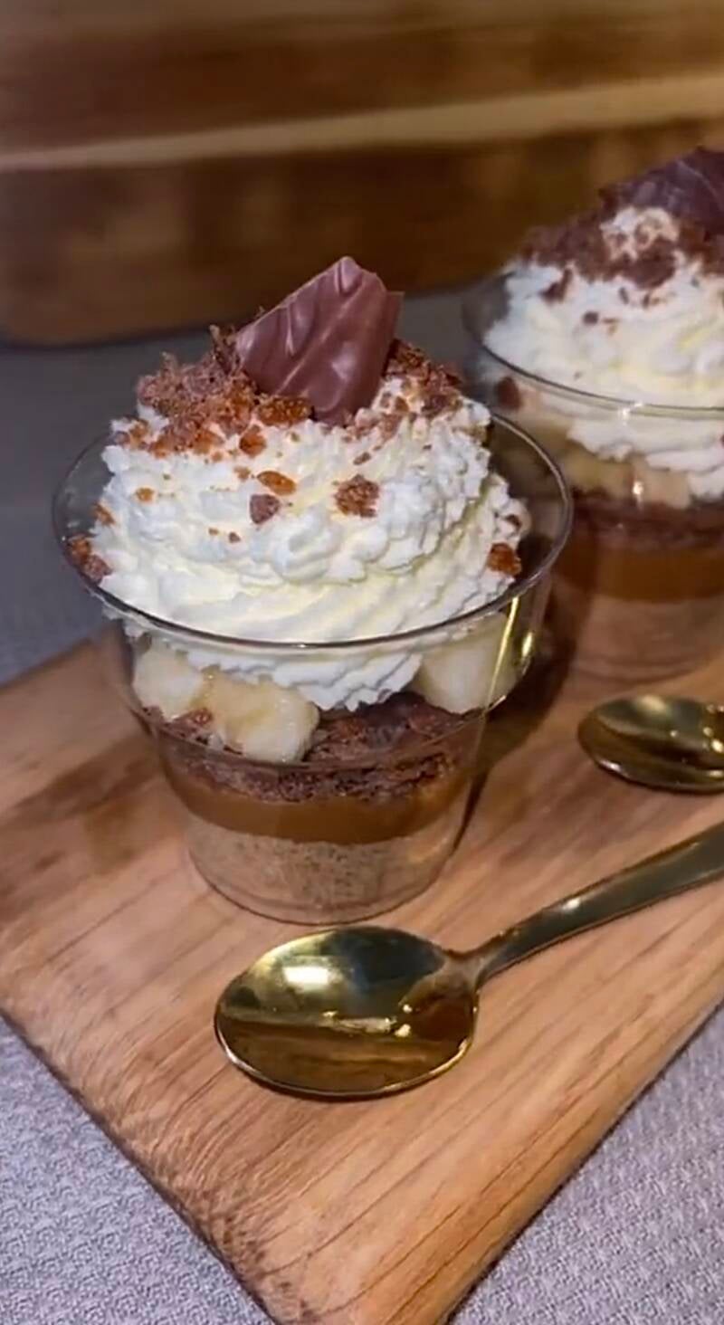 Layer the dessert in cups as in the video. Start with the crushed biscuits, dulce de leche, toffee, banana, whipping cream and lastly some more toffee with chocolate shavings.