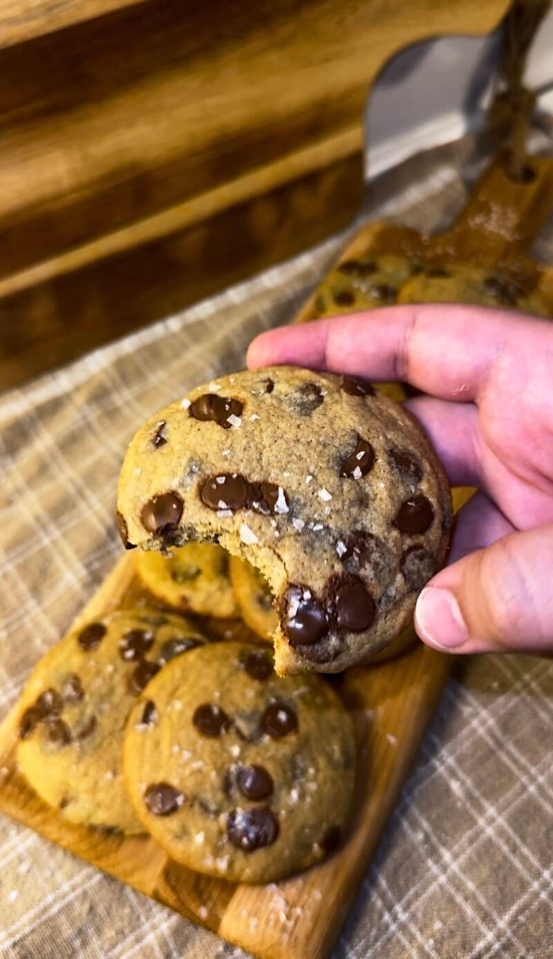 Preheat the oven, 175 degrees celcius. Blend the butter and sugar together. Then add the eggs and mix well. Now add all the dry ingredients and mix. Lastly add the chocolate chips and mix. Prepare a sheet lined with parchment paper. Scoop the cookie dough onto the sheet lined with parchment paper and bake for 12-13 minutes, 175 degrees celcius. When baked, sprinkle sole flake salt on top and let them cool for 15 minutes and enjoy!