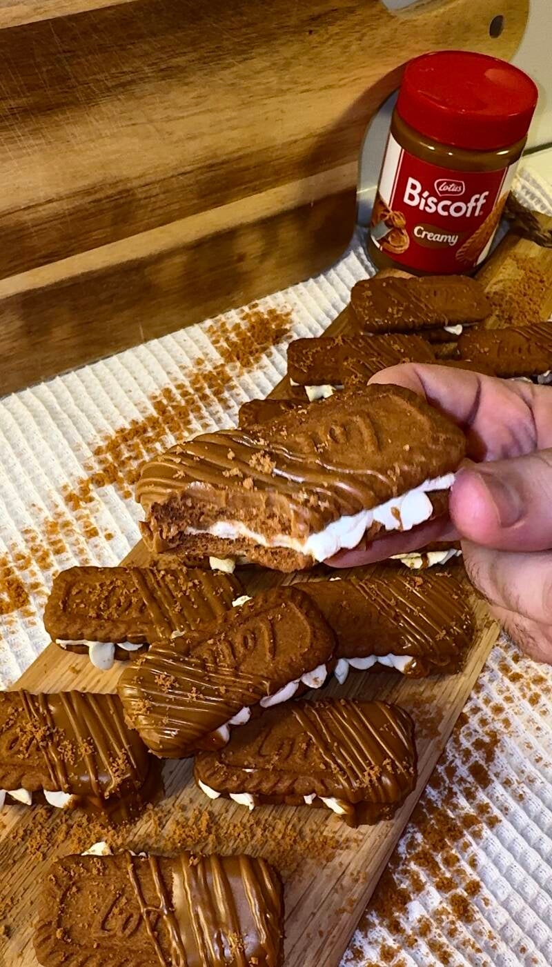 Warm the Biscoff spread in the microwave for a few seconds (around 50 seconds). Be sure to remove the lid before microwaving. Dip one side of each cookie in the spread and set it aside on the parchment paper to set.